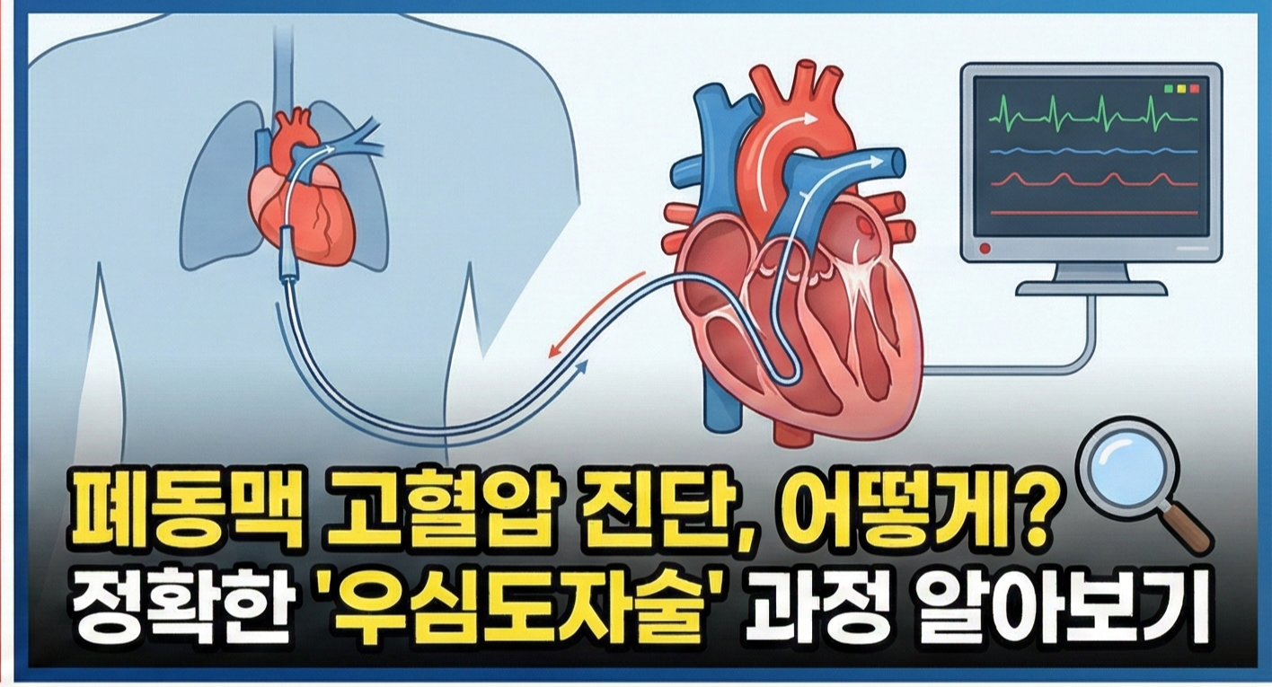 진단 과정은 조금 까다롭고 전문적입니다. 정확한 진단을 위해서는 '우심도자술'이라는 정밀 검사가 필수적이에요. 이는 가느다란 카테터(관)를 허벅지에 있는 대퇴정맥을 통해 넣어, 오른쪽 심장을 지나 폐동맥까지 진입시켜 직접 압력을 재는 방식입니다. 다소 침습적인 검사라 부담스러울 수 있지만, 원인 모를 호흡곤란의 원인을 밝히고 생명을 지키기 위해서는 반드시 필요한 과정이랍니다.