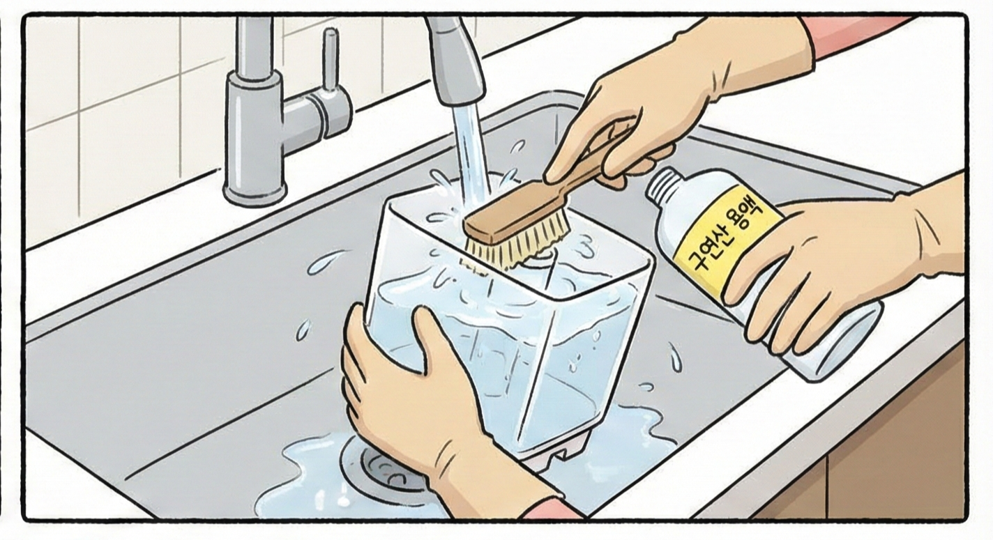 – 이 과정은 하얗게 앉은 물때(석회질)와 냄새 제거에 특히 효과적입니다. - 3단계: 깨끗한 물로 ‘여러 번 헹구기’